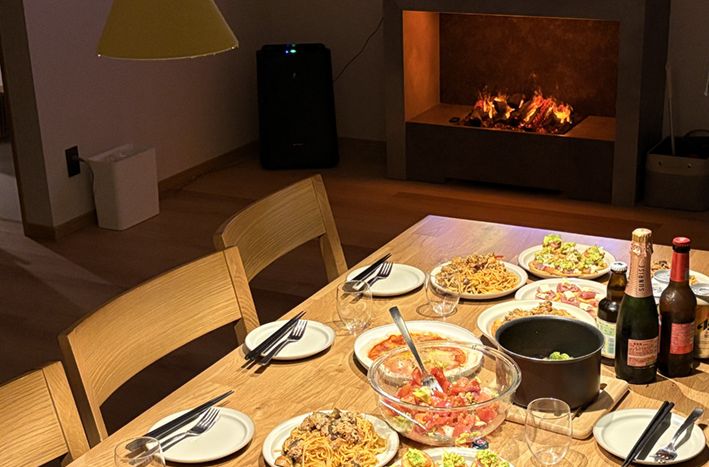 部屋の中に焚き火風の暖房設備があったのですが、食事と一緒に撮ると映えて良かったです。