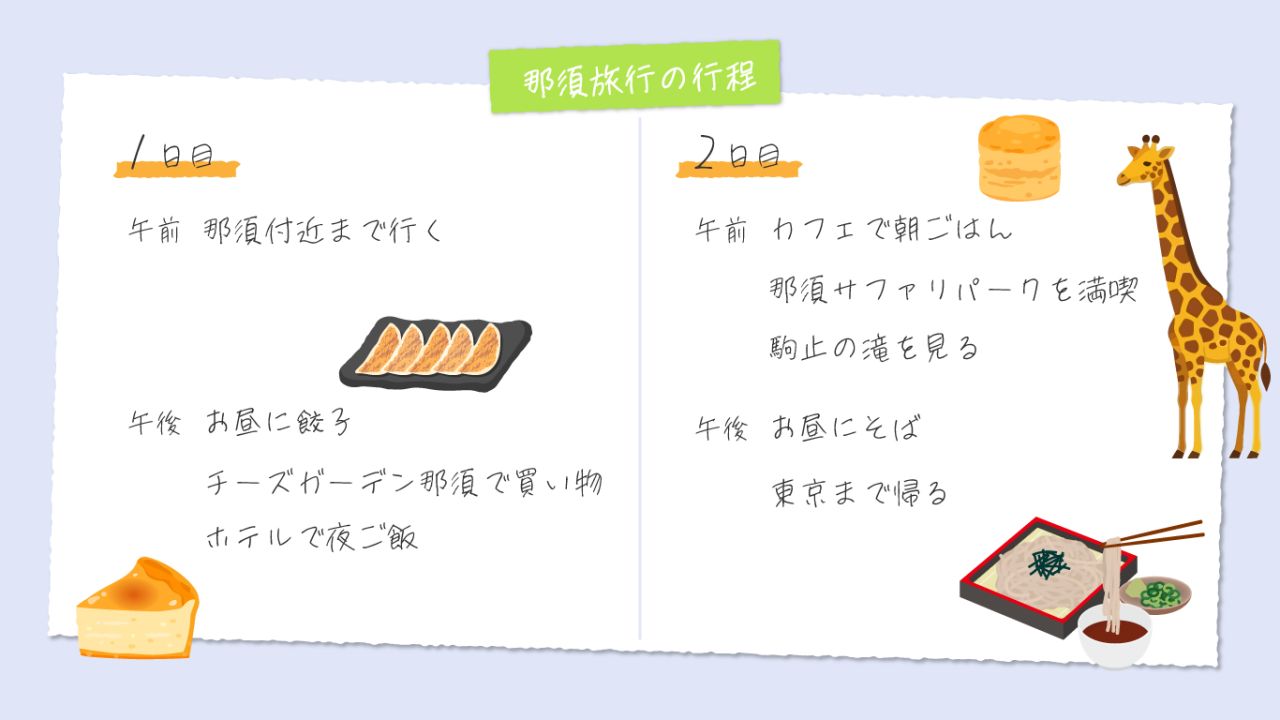 行ったところや食べた美味しいものをご紹介していくので、那須旅行に行こうかなと思っている方や、興味があるという方はぜひ読んでみてください!